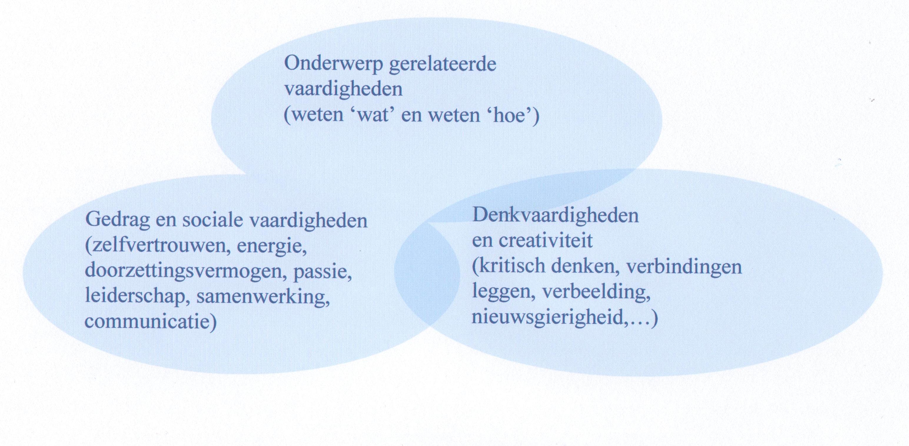 ‘Non-routine skills’ worden cruciaal, voorname-lijk ‘non-routine analytic skills’ en ‘non-routine interactive skills’. De schoolse vormen van onderwijs en testing zijn echter in grote mate afgestemd op routinematige vaardigheden. Het onderwijs bereidt voor op ‘routine skills’, op ‘non-routine’ skills scoren we niet goed. Er ontstaat internationaal consensus over de competenties voor de 21ste eeuw. Men kan die opdelen in drie groepen competenties: de ‘subject based skills’, de ‘behaviour and social skills’ en de ‘skills in thinking and creativity’. Dit geeft een goed samenvattend beeld van de competenties die nodig zijn voor de economie van de 21ste eeuw, voor de samenleving van de 21ste eeuw.”